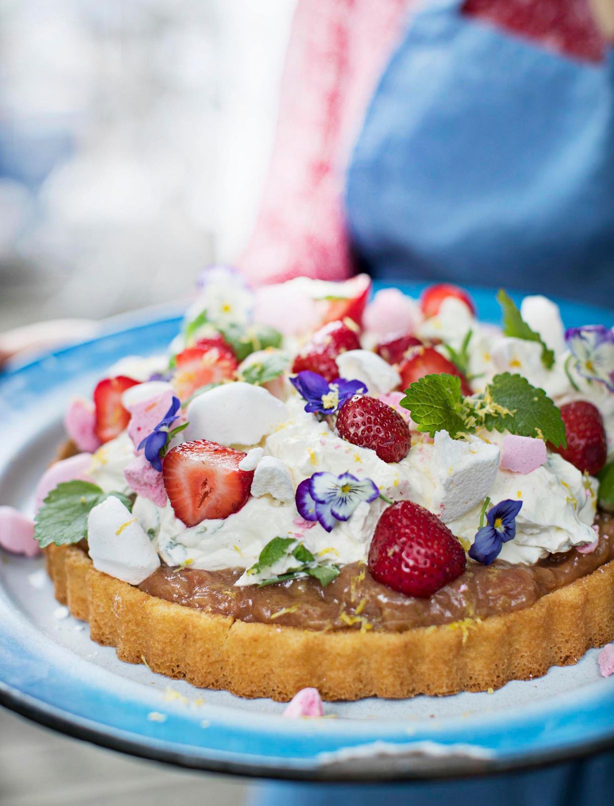 Lusikoi jäähtynyt hilloke torttupohjalle. Levitä päälle rahkavaahto. Viipaloi päälle mansikoita. Laita loput marengit tortun pinnalle ja koristele syötävillä kukilla, kuten orvokeilla.