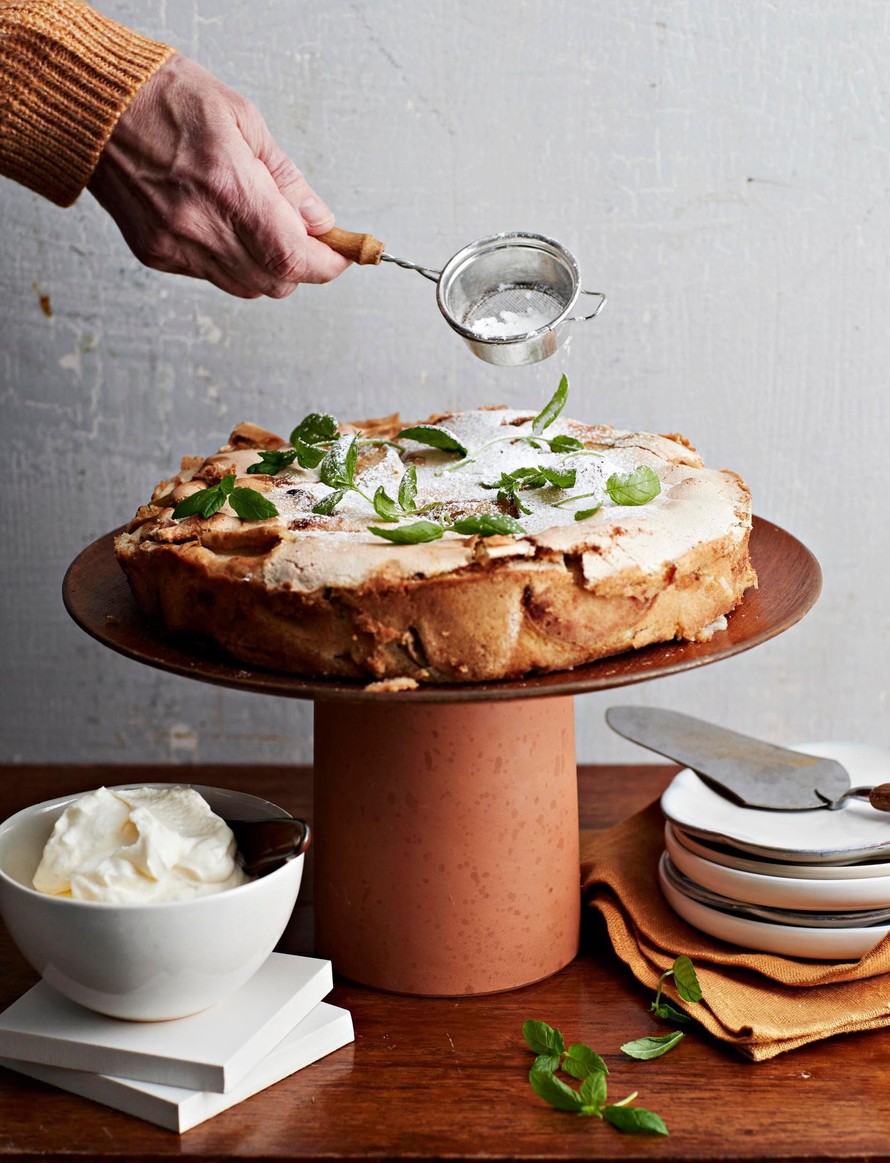 Venäläisen omenakakun kuohkean taikinan alla piilee muhkea määrä omenoita.