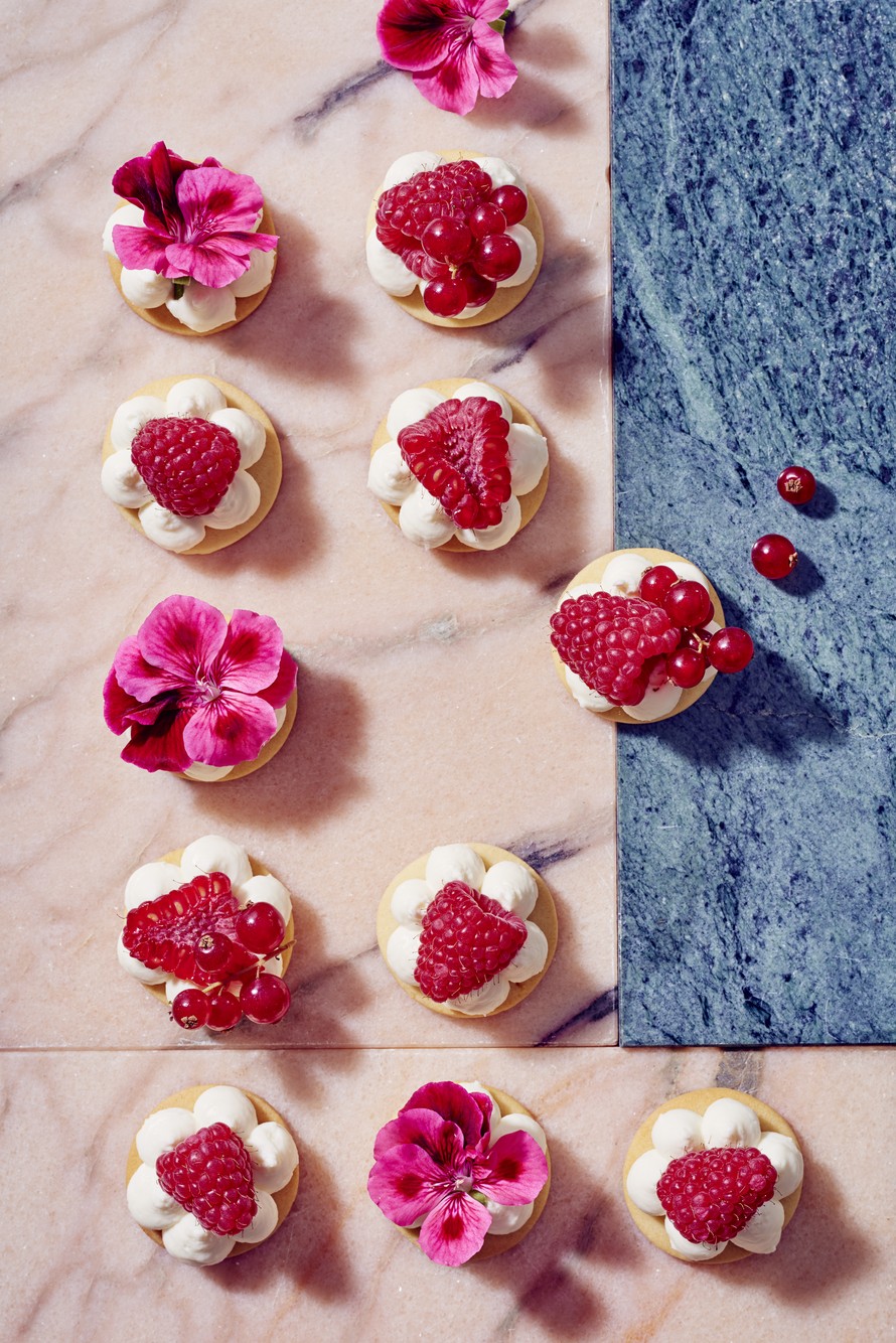 - Pursota keksien reunoille 5–6 pursotusta mascarponevaahdolla ja keskelle yksi pursotus sitruunatahnalla. Koristele vadelmilla, punaherukoilla ja syötävillä kukilla.