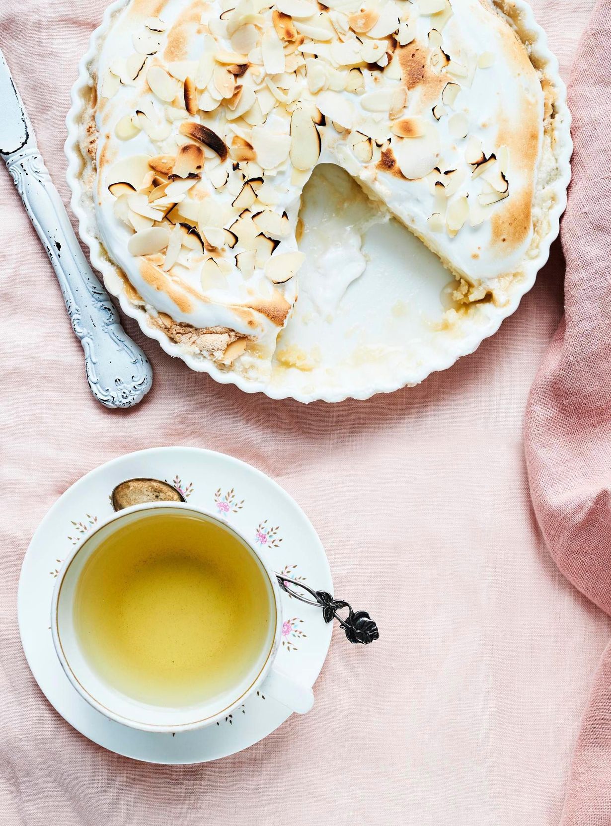 Kirpeän makea sitruunapiirakka ja vihreä tee ovat täydellinen makupari. Piiras sopii vegaanille, sillä marenki vatkataan säilykekikherneiden säilöntäliemestä.