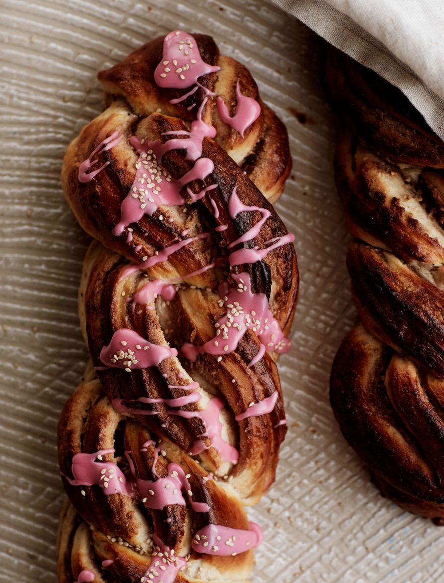 Haluatko leipoa jotain täydellistä? Tee pehmeä pulla, jonka kierteissä yhdistyvät vadelma ja tahini.