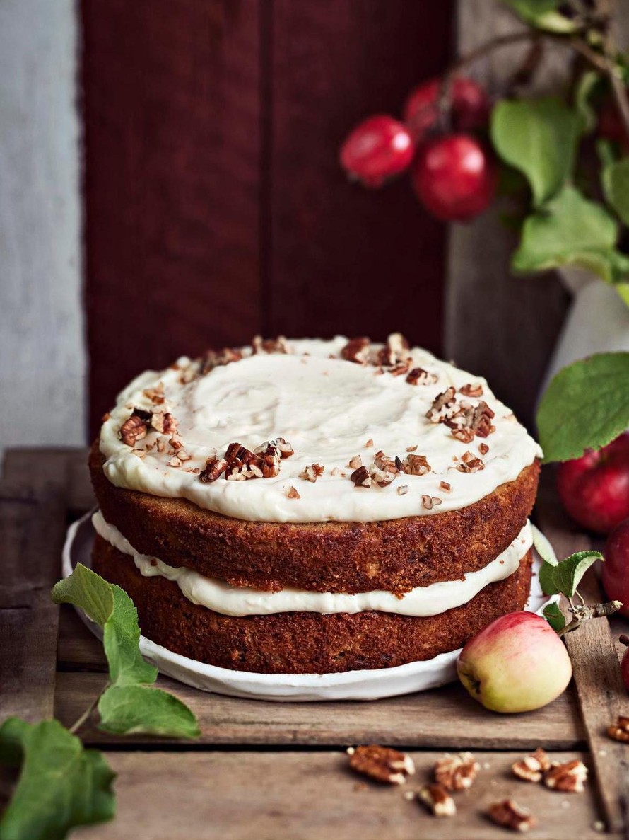 Mausteinen, supermehevä omenakakku kulkee sujuvasti porkkanakakun jalanjäljissä. Mikäli pienet kuorenpalaset eivät takerru helposti kurkkuun, voit hyvin jättää omenat kuorimatta.