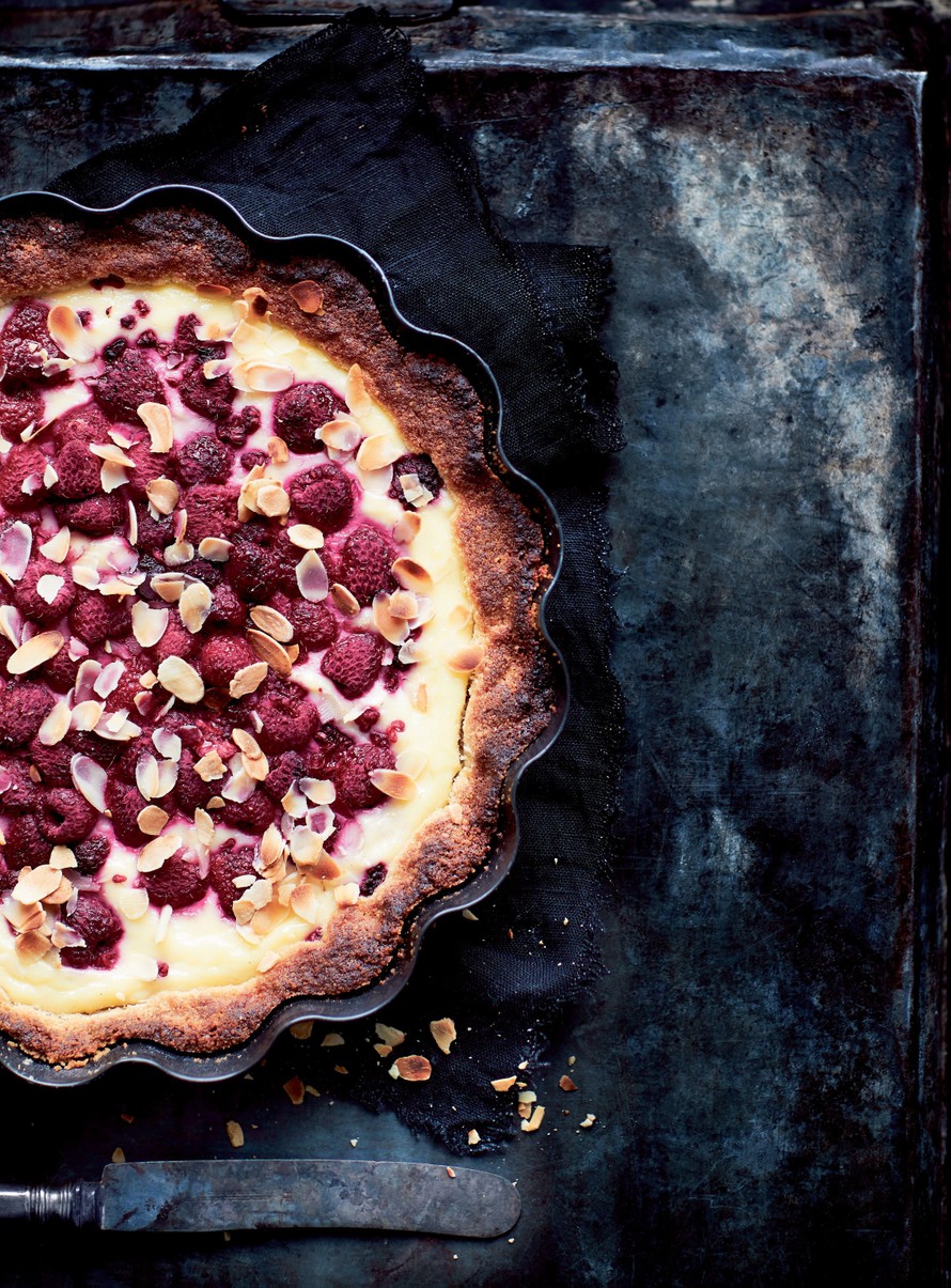 - Levitä täyte piirakalle. Ripottele pinnalle kohmeiset tai tuoreet marjat ja mantelilastut.