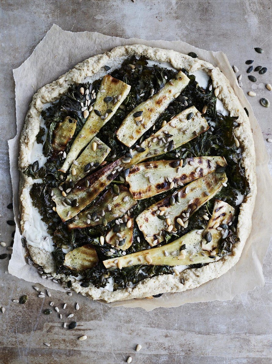 Tämä herkullinen galette on sekä gluteeniton että vegaaninen. Piirakka on ihanimmillaan suoraan uunista nostettuna, kun lehtikaalit ovat rapeita ja palsternakat ihanasti paahtuneita.