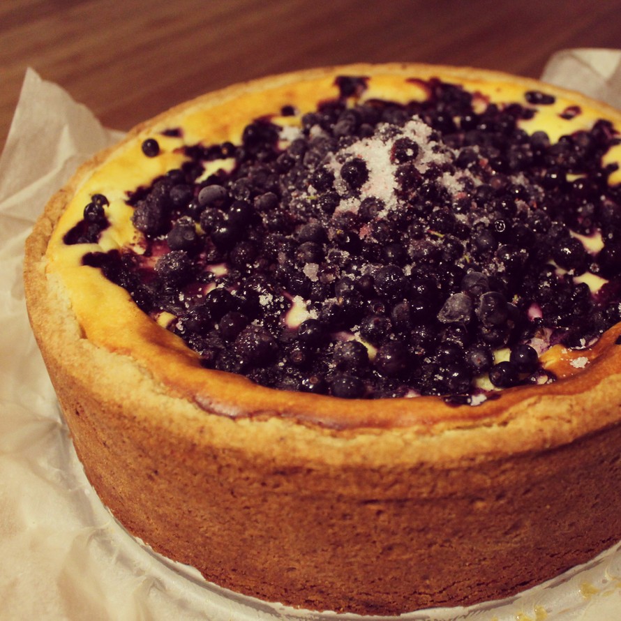 Yhdistä kulhossa kaikki täytteen aineet. Vatkaa seosta sähkövatkaimella n. 3 min, kunnes se on tasaista ja kuohkeaa. Kaada täyte taikinapohjalle. Ripottele kakun pinnalle mustikat.