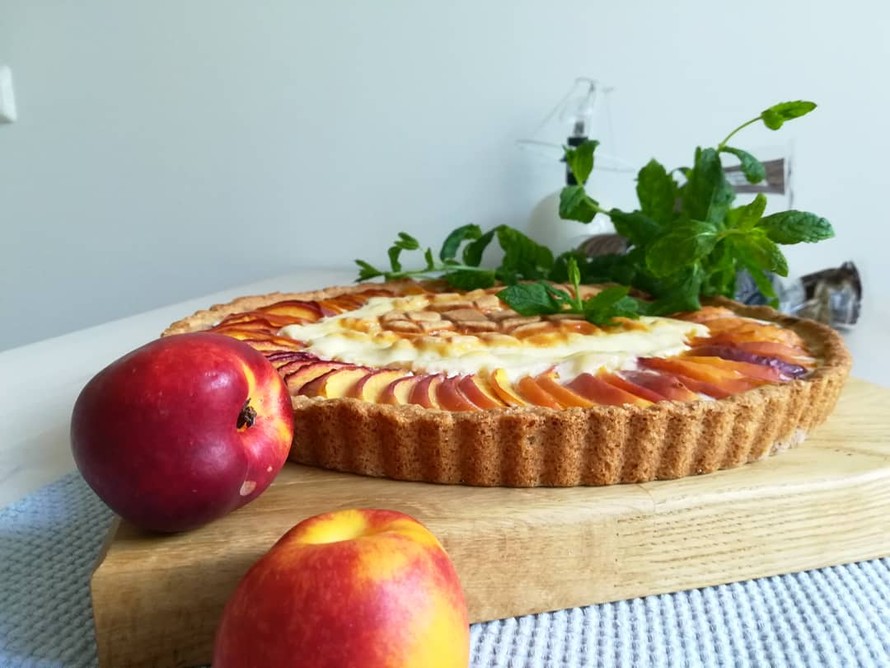 Sekoita jugurttitäytteen kaikki aineet keskenään. Pursota täyte raidoiksi piirakkataikinan päälle. Leikaa nektariinit viipaleiksi levittele pintaan.
