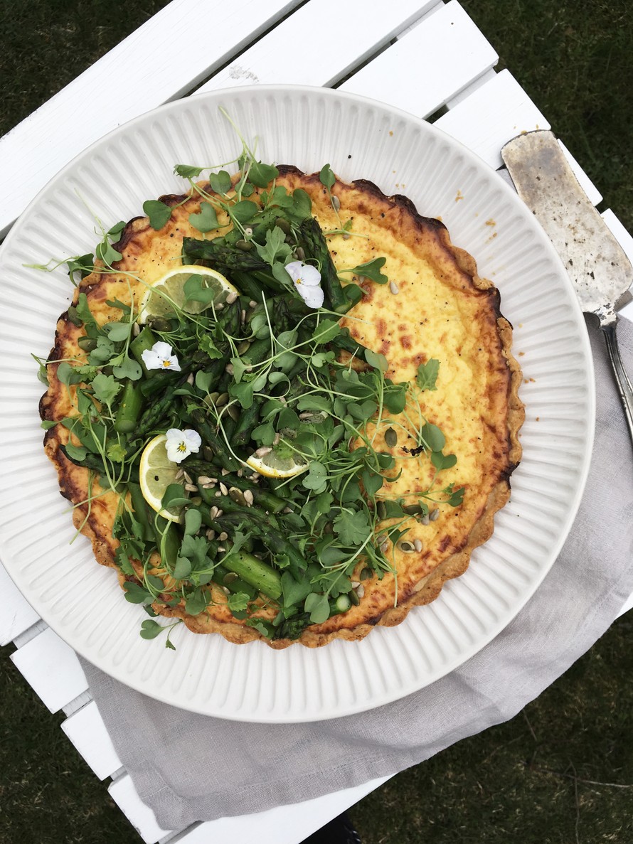 Yksinkertainen, rapeapohjainen juustopiirakka sopii versoilla ja paistetuilla vihreillä parsoilla päällystettynä kaikkiin kevään pieniin juhliin.
