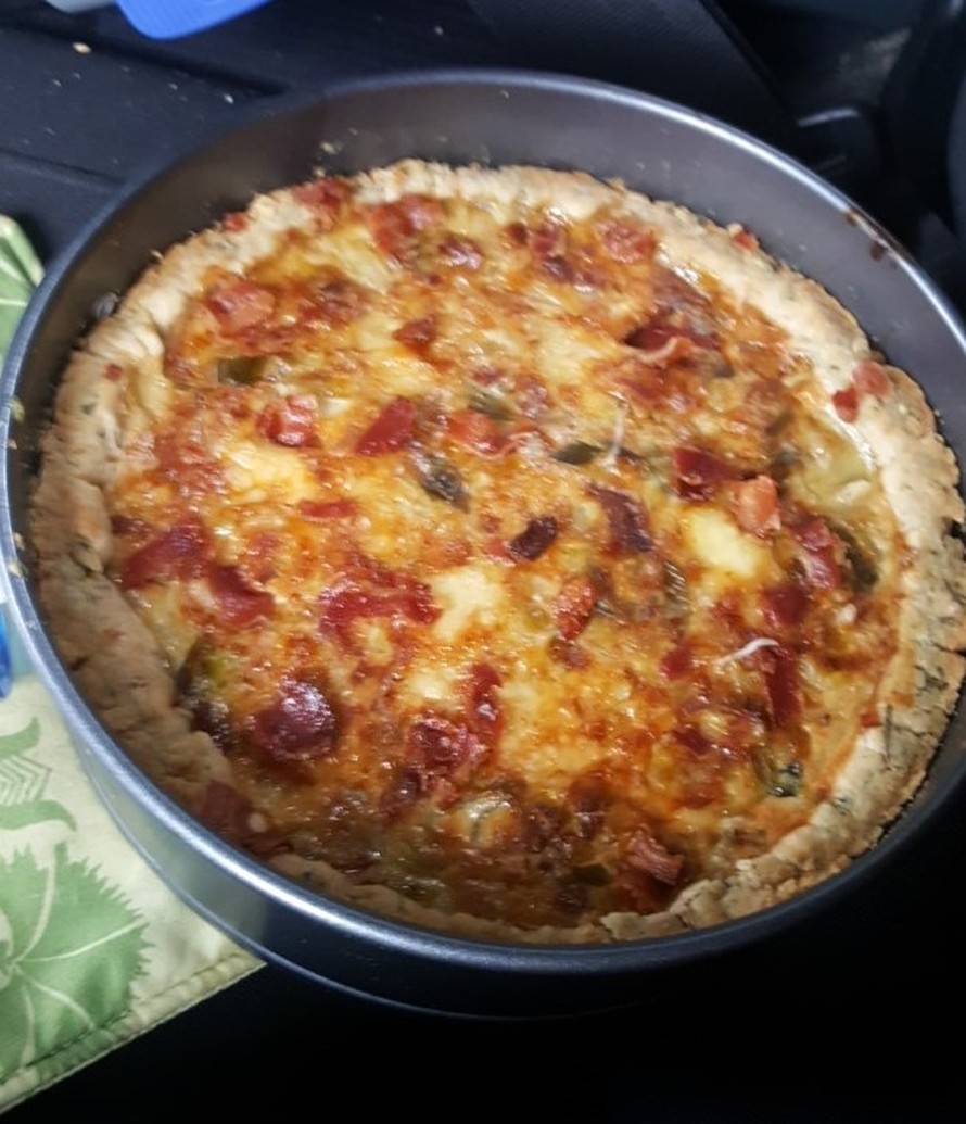 8. Lisää purjo-sipuliseos ja viipaloidut pekonit esipaistetun taikinan päälle.