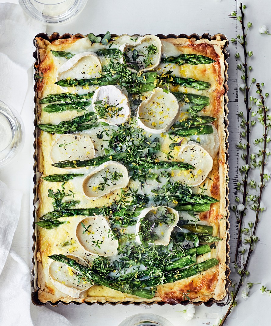 Tässä piirakassa ei säästellä maussa: täytteessä kolmea juustoa ja kevään suosikkia eli parsaa.