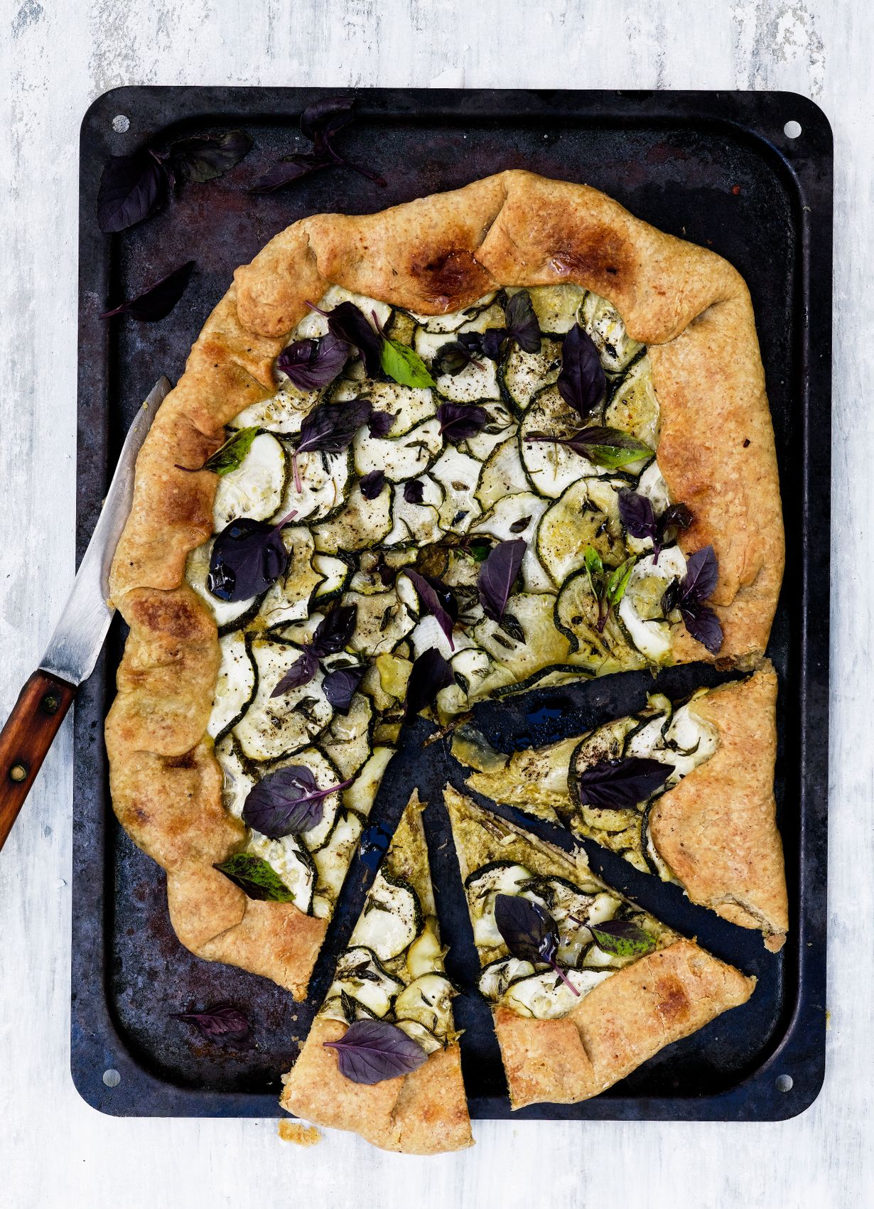 5. Kauli taikina isoksi kiekoksi. Levitä tuorejuustotahna pohjalle ja kesäkurpitsat sen päälle. Mausta suolalla. Hienonna timjami ja ripota se galetten pinnalle. Taita taikinan reunat täytteen päälle. Paista uunissa 40 minuuttia.