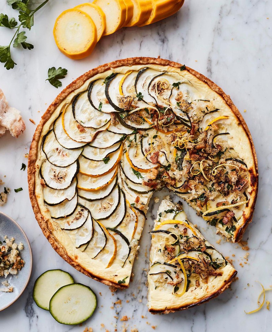 Rapea, sitruunalla maustettu pohja ja mehevä ricottatäyte. Kesäkurpitsan säestäjät ovat tässä piirakassa parhaasta päästä.