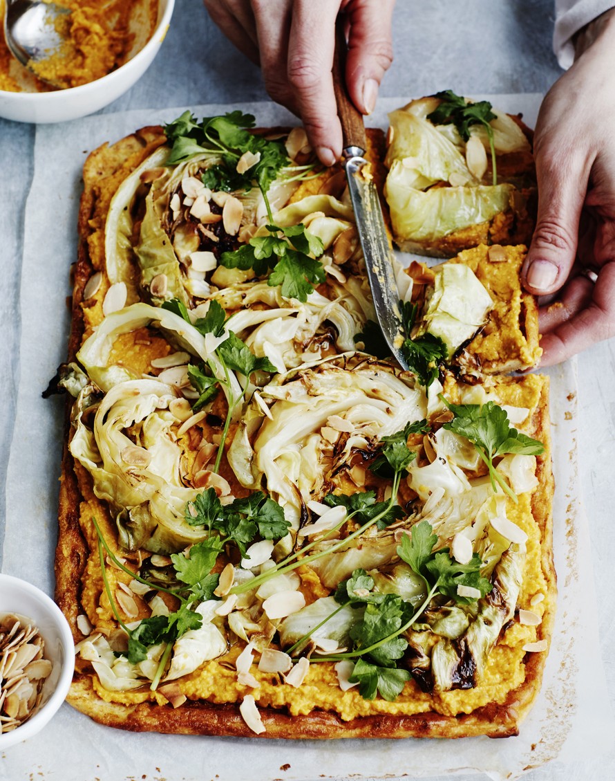 Paahdettu kaali ja porkkana-linssitahna ovat vastustamaton makupari tässä ruokaisassa pannukakussa.