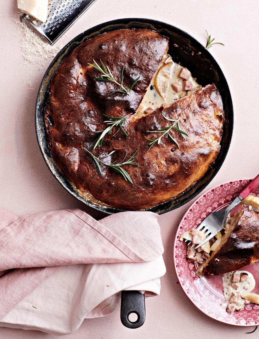 Tässä yhden pannun kinkku-omenapiiraassa täyte ja taikina vaihtavat paikkaa. Valitse käyttöösi valurautapannu, joka on kahvaa myöten uuninkestävä.