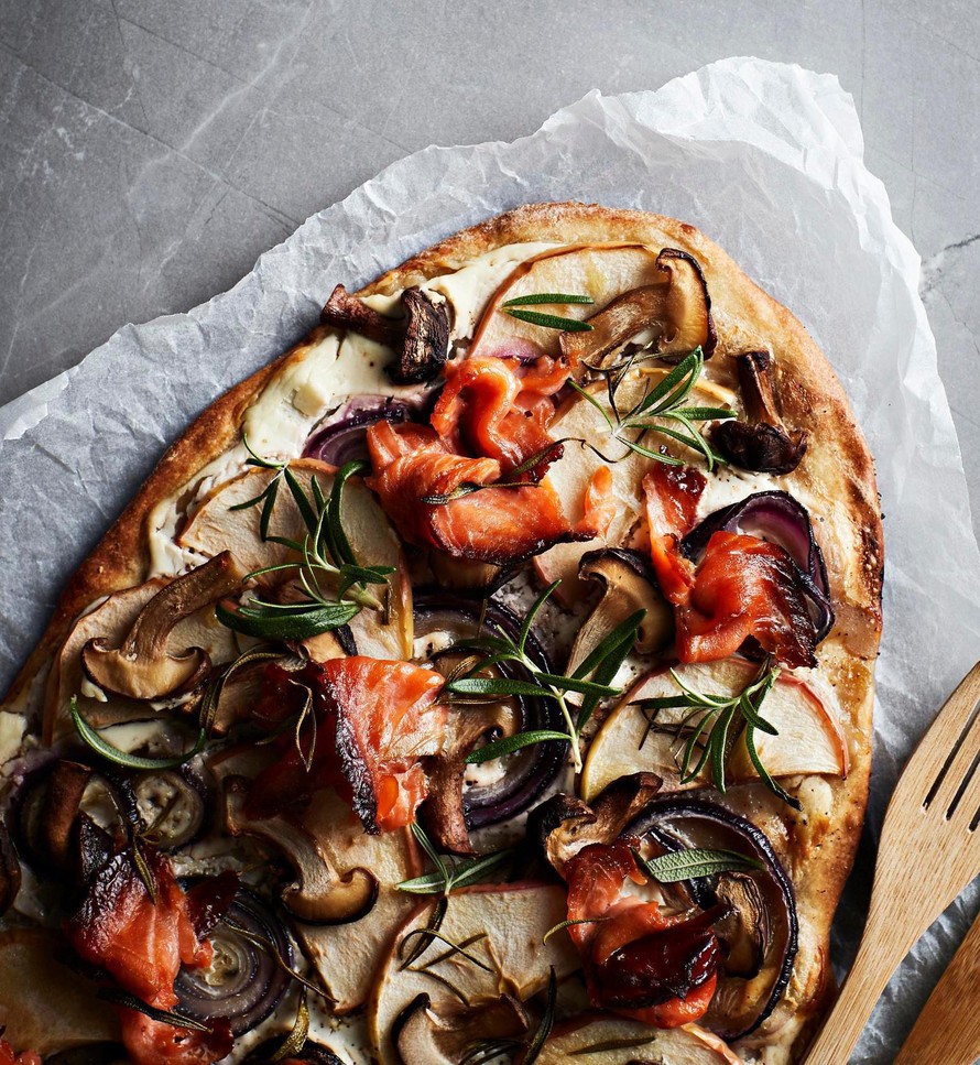 Mausta ranskankerma suolalla ja pippurilla ja levitä se pohjan päälle. Laita sienet, sipulit, omena ja kylmäsavulohi siivuina pinnalle. Ripottele päälle vielä rosmariinia.