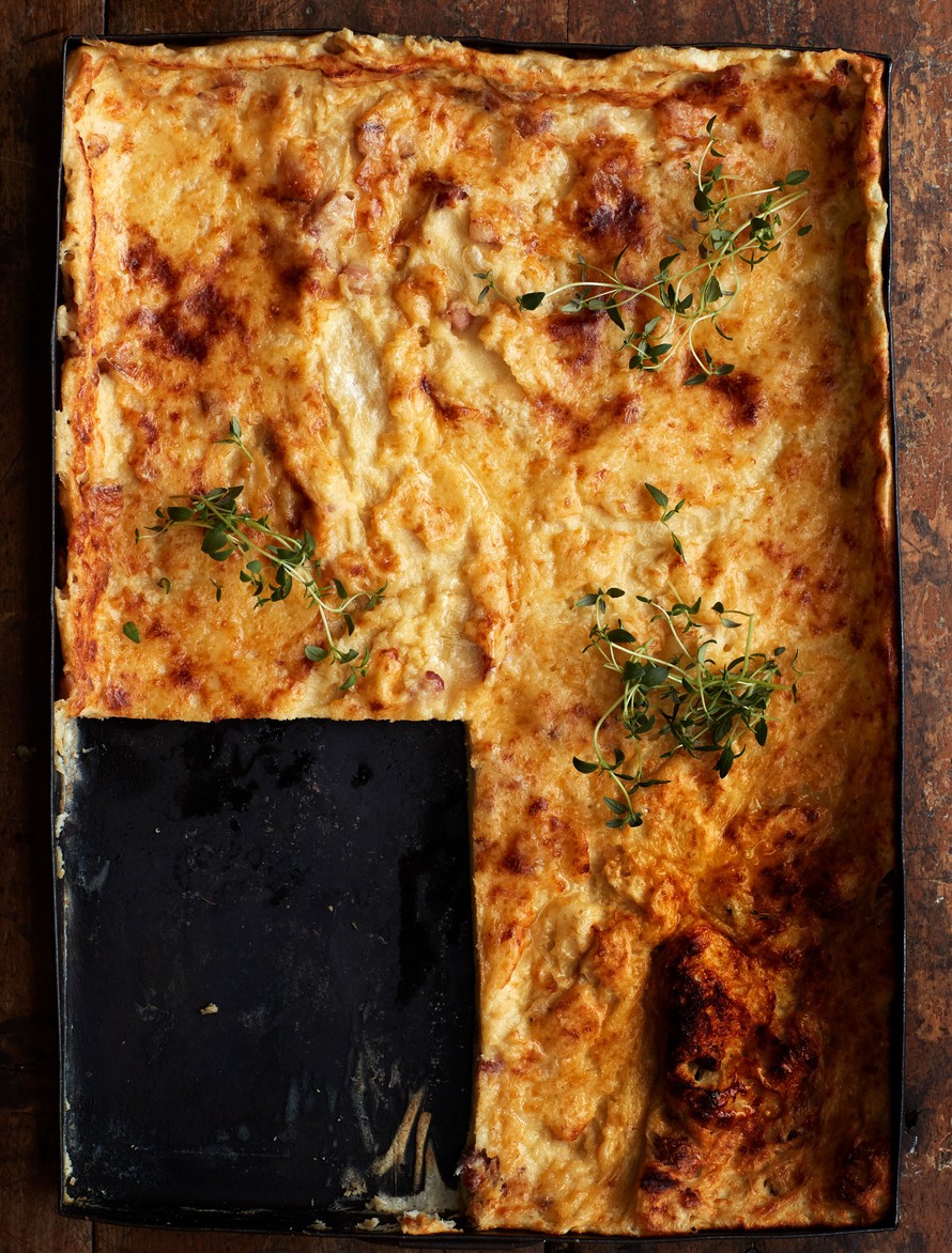 Taikinan joukkoon sekoitetaan rapeaksi paistettua pekonia, kuullotettua sipulia sekä gruyère-juustoa. Vajaa puoli tuntia uunissa, ja pekonipannari on paahtunut kypsäksi ja herkulliseksi. Parhaimmillaan se on uunilämpimänä salaatin kanssa.