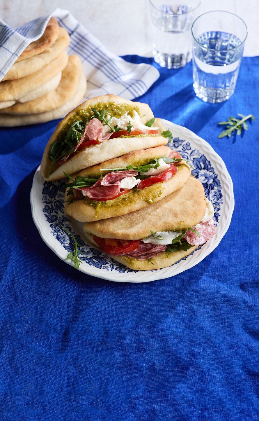 - Täytä kuumat taskut pestolla, salamilla, mozzarellalla, tomaatilla ja rucolalla. Tarjoa heti.