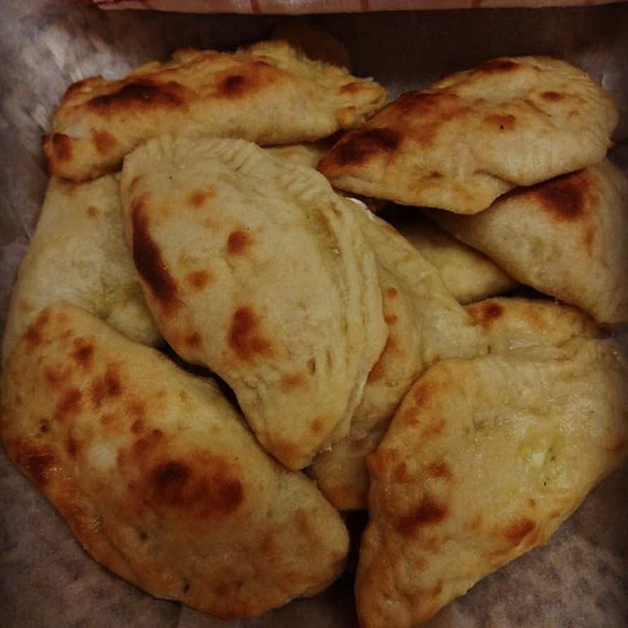 6. Lisää kuorten toiselle puoliskolle lusikallinen riisitäytettä ja taita vatruskat puolikuun muotoon.