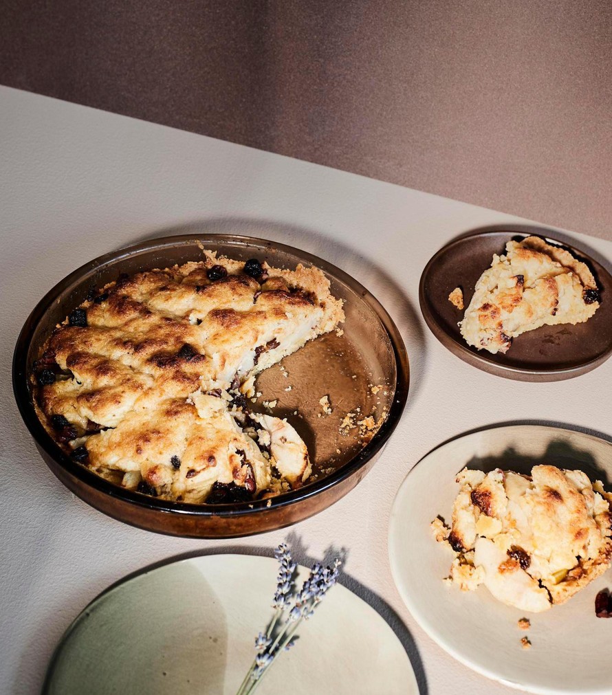 Painele taikina voideltuun piirakkavuokaan. Levitä omenat (kahteen kerrokseen) taikinalle, kaada päälle rusinat ja mehu. Ripottele pähkinät vuokaan.