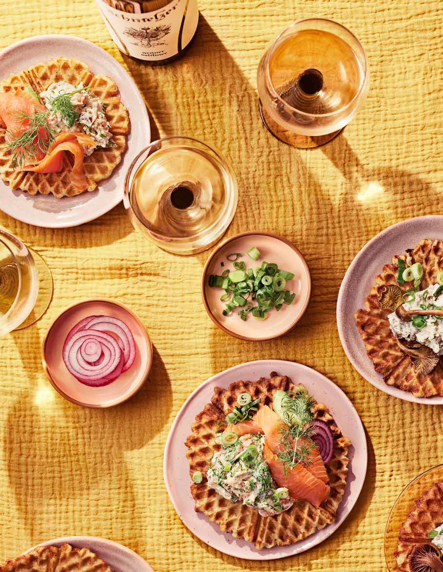 Blinit voi paistaa mainiosti myös vohveliraudalla. Ihanan rapeiden blinivohveleiden täytteeksi sopivat lohitahna ja sienet.