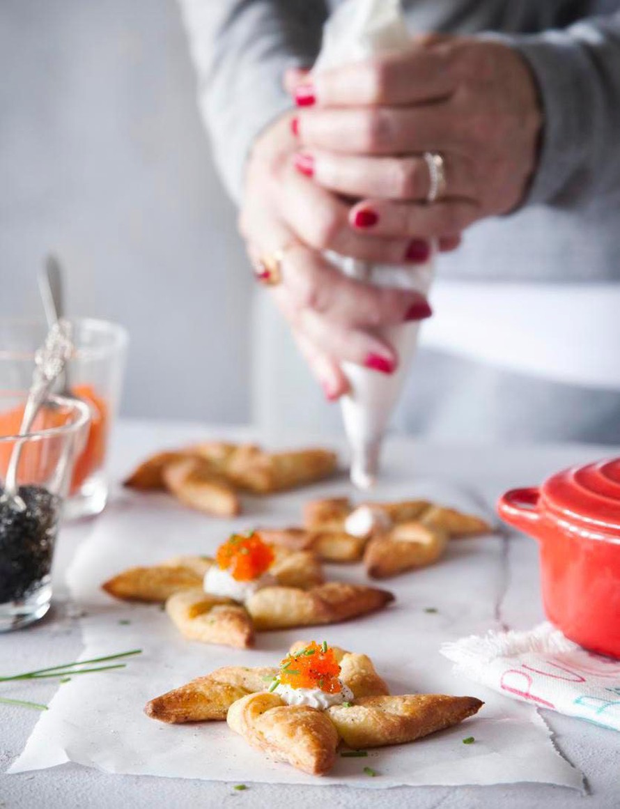 Kauli taikina puoli senttiä paksuksi levyksi. Leikkaa levystä neliöitä, joiden sivut ovat noin 10 cm pitkiä. Leikkaa viillot joulutorttujen tapaan ja taittele sakarat. Siirrä paistovalmiit tortut pellille ja pakastimeen vartiksi. Paista 200–225-asteissa uunissa 7–10 minuuttia.