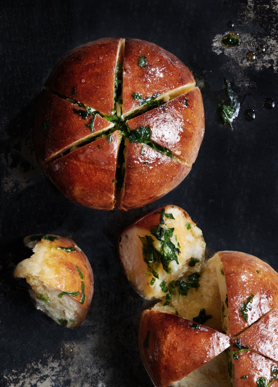 Sulata loppu valkosipuli-persiljavoi. Kasta kuumat sämpylät voisulaan yläpuoli edellä heti paahtamisen jälkeen. Tarjoa heti.