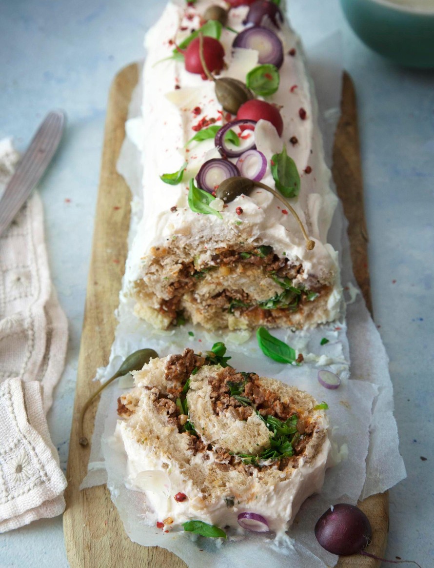 Rullaa levy tiukasti kääretortun tapaan. Kääri rulla leivinpaperiin. Anna tekeytyä jääkaapissa muutama tunti tai seuraavaan päivään.