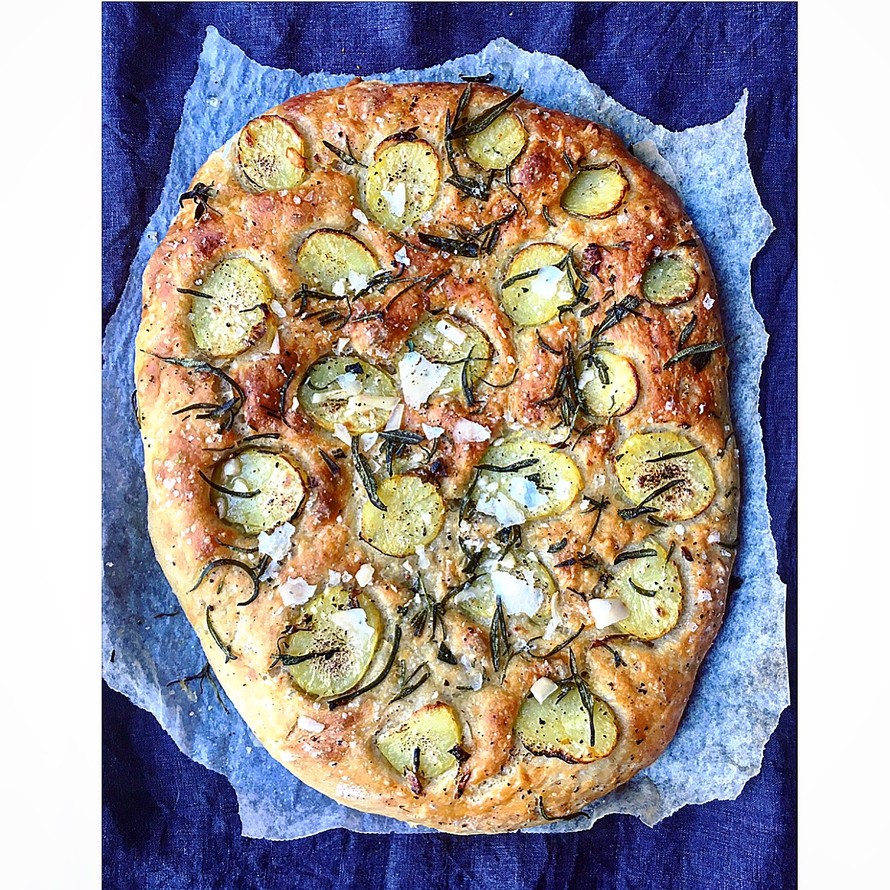 Hieman rapsakoitunut peruna on täydellinen lisä klassiseen focacciaan. Ihana tuplahiilariherkku viimeistellään tuoreella rosmariinilla, sormisuolalla ja parmesan-lastuilla.