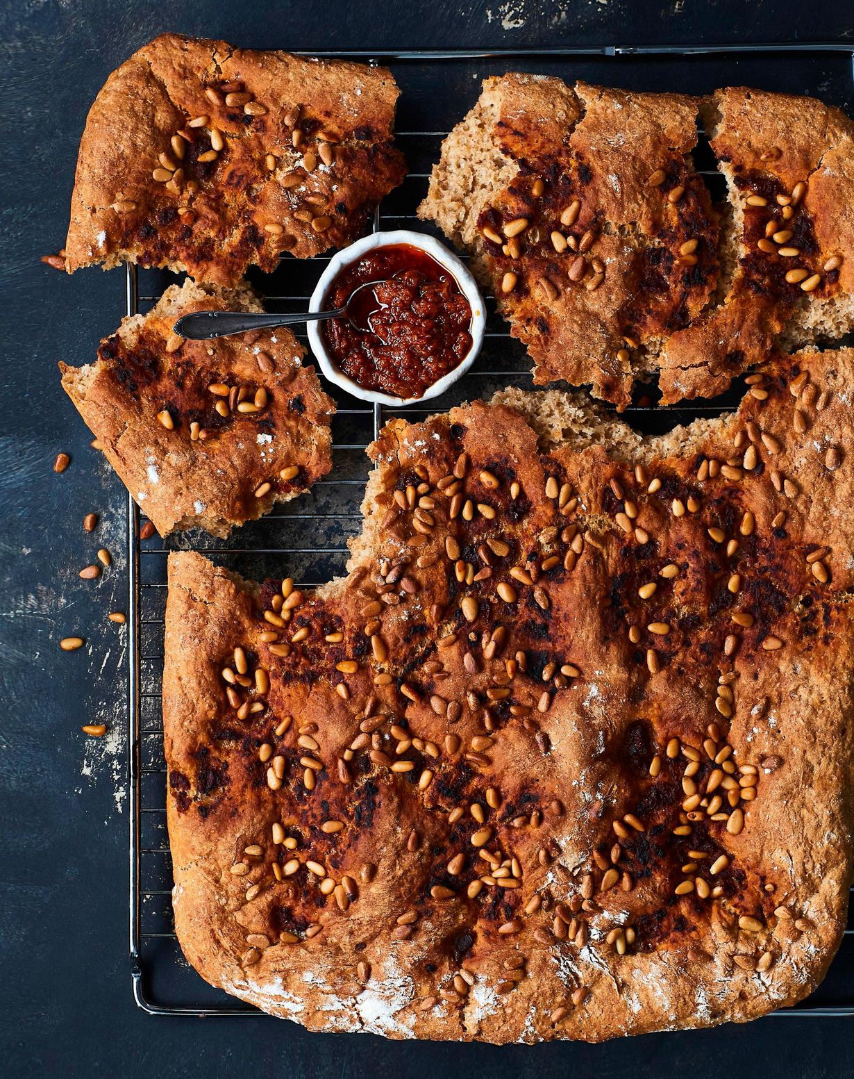 - Kumoa taikina leivinpaperin päälle uunipellille ja taputtele se jauhotetuin käsin pellin kokoiseksi levyksi. Lisää päälle pesto nokareina ja vetäise se veitsellä viiruiksi taikinaan. Ripottele päälle pinjansiemenet. Anna leivän kohota esimerkiksi toisella ylösalaisin käännetyllä pellillä peitettynä noin tunnin ajan.
