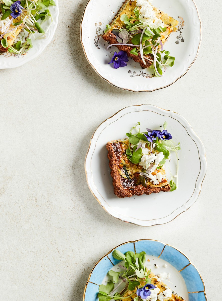 Sekoita kerma, munat, sulatettu pinaatti ja sitruunankuori kulhossa. Kaada esipaistetulle piirakkapohjalle. Levitä päälle kesäkurpitsalastut ja fetajuusto. Paista 25–30 minuuttia, kunnes täyte on hyytynyt ja kauniin ruskea. Anna piirakan jäähtyä. Leikkaa annospaloiksi. Koristele miniversoilla ja kukilla.