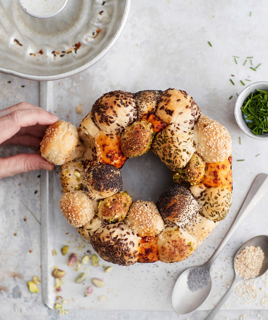 Paista sämpyläkranssia noin 45 minuuttia. Peitä vuoka foliolla paistamisen puolivälissä. Anna leivän jäähtyä vuuassa 5 minuuttia ennen irrottamista.