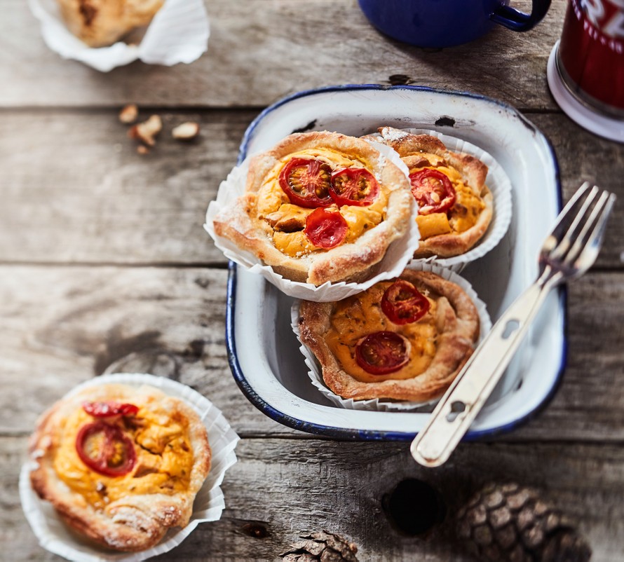 Mehevän tuorejuustotäyteen joukossa on savutofusuikaleita, joiden maku muistuttaa savukinkkua. Jos leivot muffinipitsat edellisenä päivänä, säilytä niitä jääkaapissa.