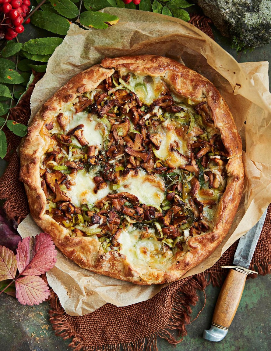 Rapeapohjainen sienipiiras valuu mehevää mozzarellaa.