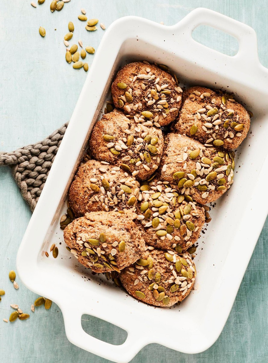 Laita sämpylät voideltuun uunivuokaan. Voitele pinta vedellä ja ripottele päälle siemeniä.