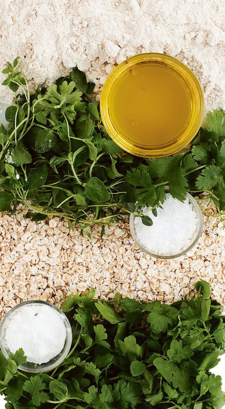 Sekoita kuivat aineet kulhossa keskenään. Lisää yrtit, vesi ja öljy.