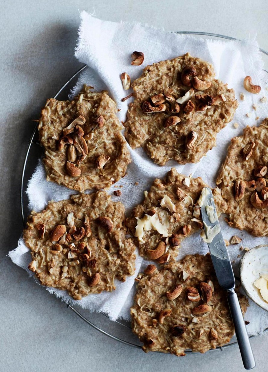 - Jaa seos leivinpaperin päälle pellille yhdeksäksi kasaksi. Taputtele kasat lusikalla ohuiksi leipäsiksi. Ripottele päälle rouhittuja pähkinöitä.