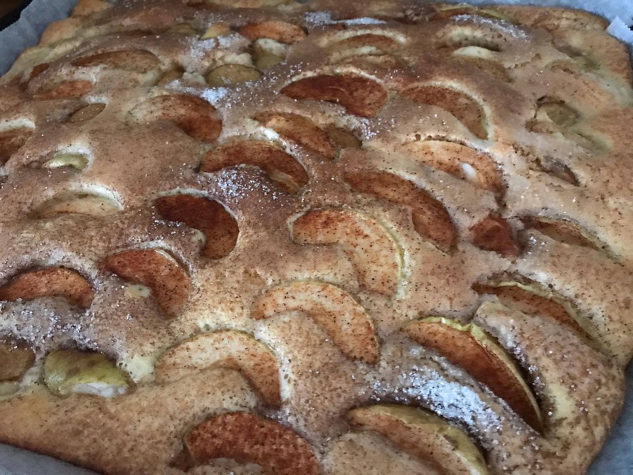 Vatkaa munat ja sokeri käsin kuohkeaksi vaahdoksi. Sekoita kuivat aineet keskenään ja lisää vahtoon. Mittaa maito ja öljy ja laita nekin taikinan sekaan. Sekoita hyvin.Voit antaa tässä vaiheessa taikinan odottaa. Kuori omenat, poista siemenkota ja leikkaa ohuita omenaviipaleita. ( Kotimaiset omenat kuorineen). Kaada taikina leivinpaperilla vuorattuun uunipeltiin ja laita omenaviipaleet päälle. Omenaviipaleiden päälle laita oman maun mukaan sokeria ja kanelia.