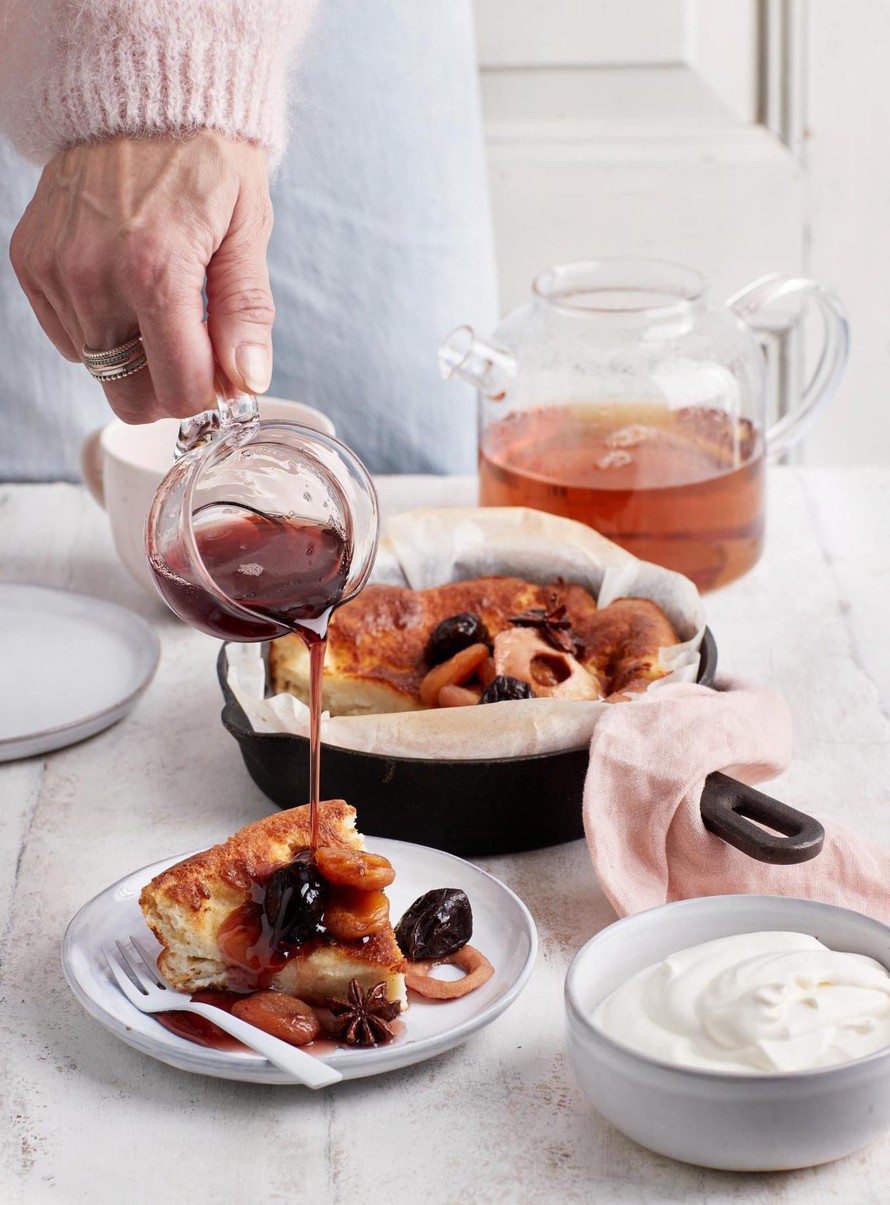 Nauti lämmin pannukakku hedelmien, glögisiirapin ja jugurttivaahdon kanssa.