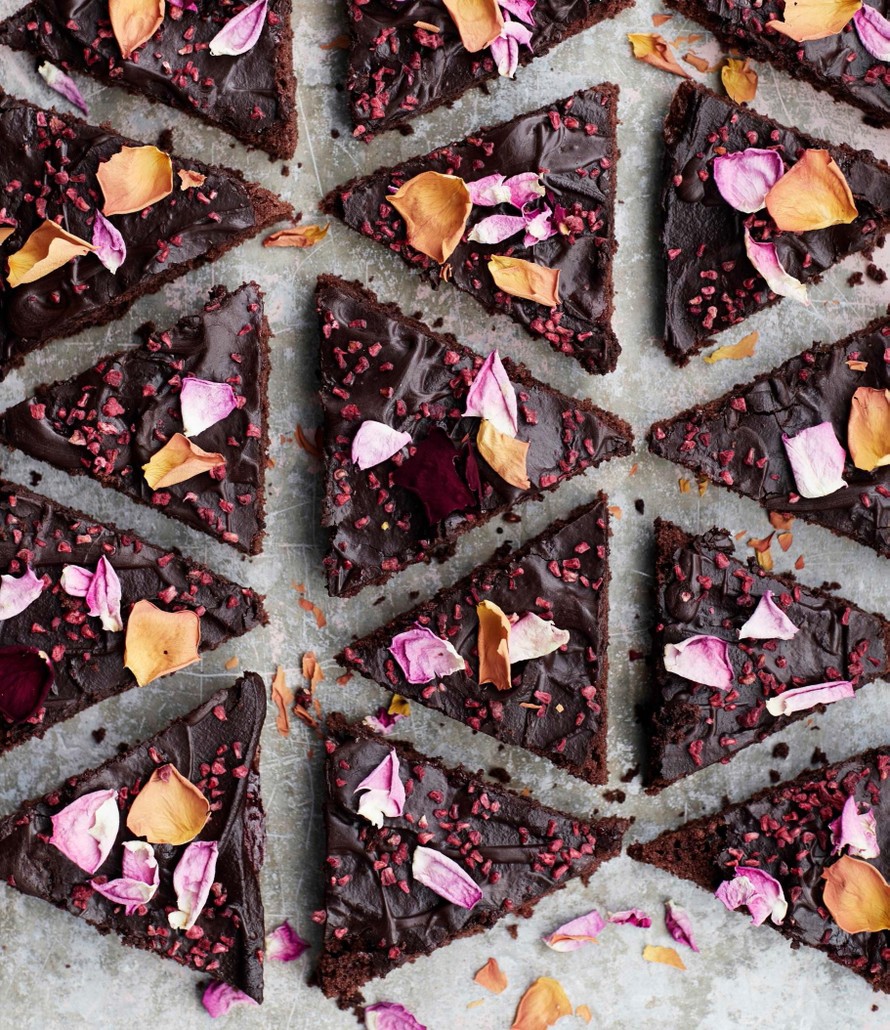 - Anna kuorrutteen jäähtyä. Jos haluat, ripottele päälle kuivattuja ruusunlehtiä tai muita syötäviä kukkia. Leikkaa levy pitkittäin kolmeen osaan ja viistosti kolmiopaloiksi