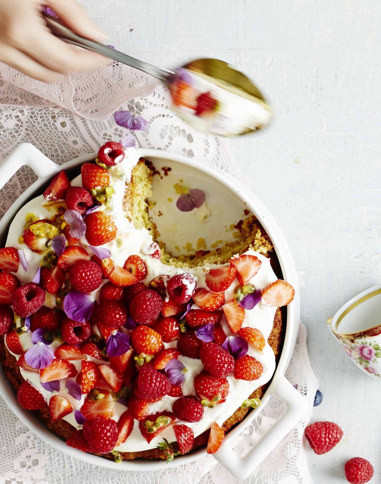 - Vaahdota kerma. Lisää jogurtti ja sokerit. Lusikoi seos jäähtyneelle kakulle. Koristele marjoilla.