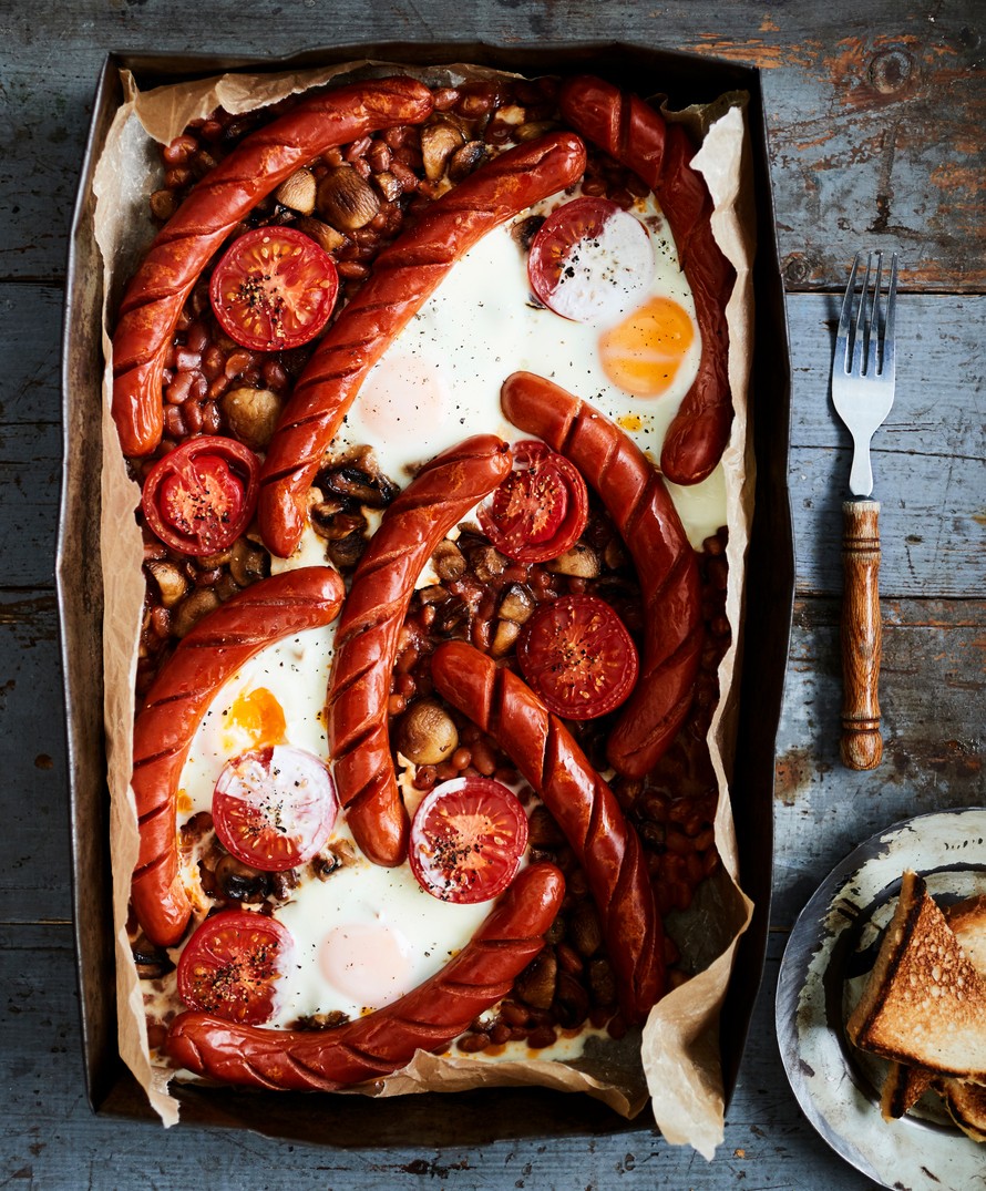 Tämä versio englantilaisesta aamiaisesta paistuu yhdessä astiassa. Siinä on kaikki: makkaraa, papuja, sieniä, tomaattia – ja tietysti munia.