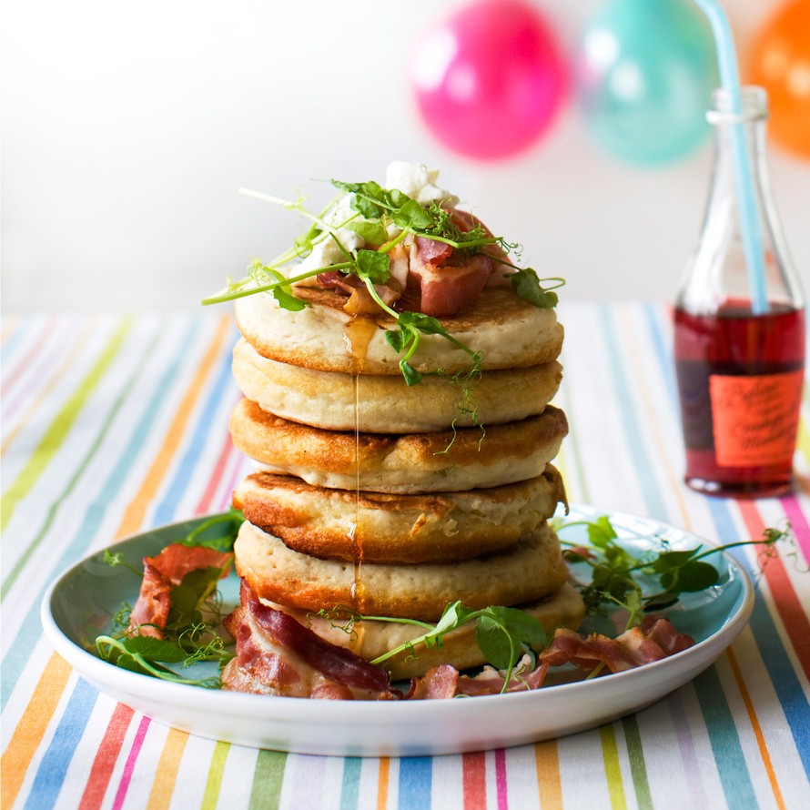 Paista kasa meheviä pannukakkuja ja tarjoa ne savupekonin ja vaahterasiirapin kanssa.