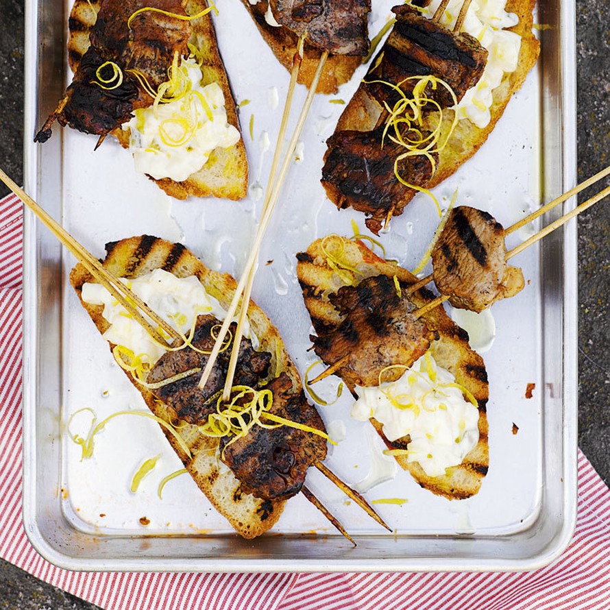 - Grillaa keskilämmöllä, välillä käännellen noin 15 minuuttia. Tarkista veitsellä, että lihat ovat kypsiä. Paahda leipiin kaunis pinta. Voit halutessasi valuttaa leiville hieman öljyä.