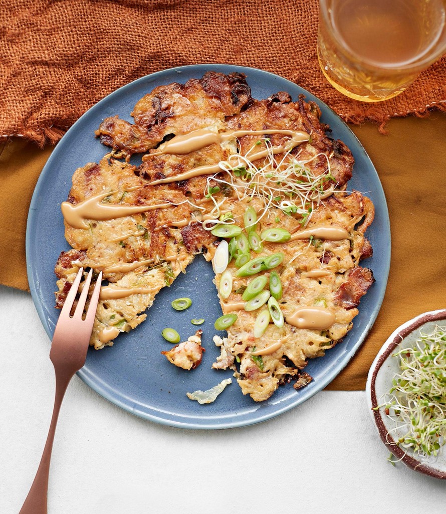 Okonomiyaki on täydellinen pannukakun ja munakkaan yhdistelmä. Munakaslettu maistuu ihanalta teriyakimajoneesin kanssa.