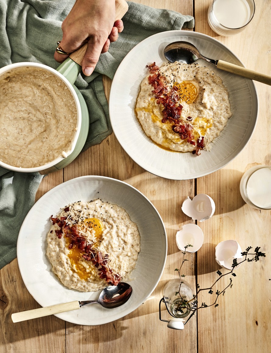 - Jaa puuro lautasille ja laita kunkin annoksen päälle yksi keltuainen. Ripottele pinnalle pekonia, parmesaania ja chiansiemeniä.