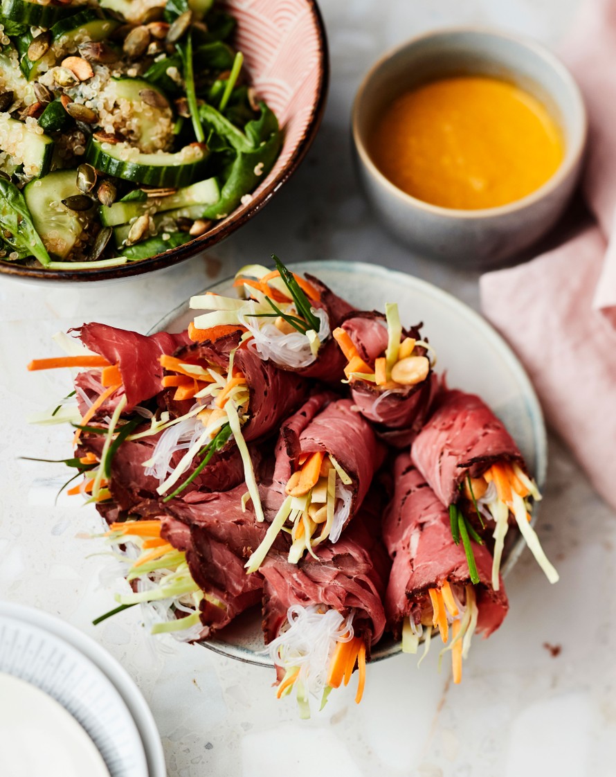 Elegantit paahtopaistirullat sopivat kesän kaikkiin juhliin. Keitä vermisellit sekä pilko kasvikset kylmään veteen edellisen päivänä. Tee myös kastike jääkaappiin. Juhlapäivään jää vain helppo rullausvaihe.