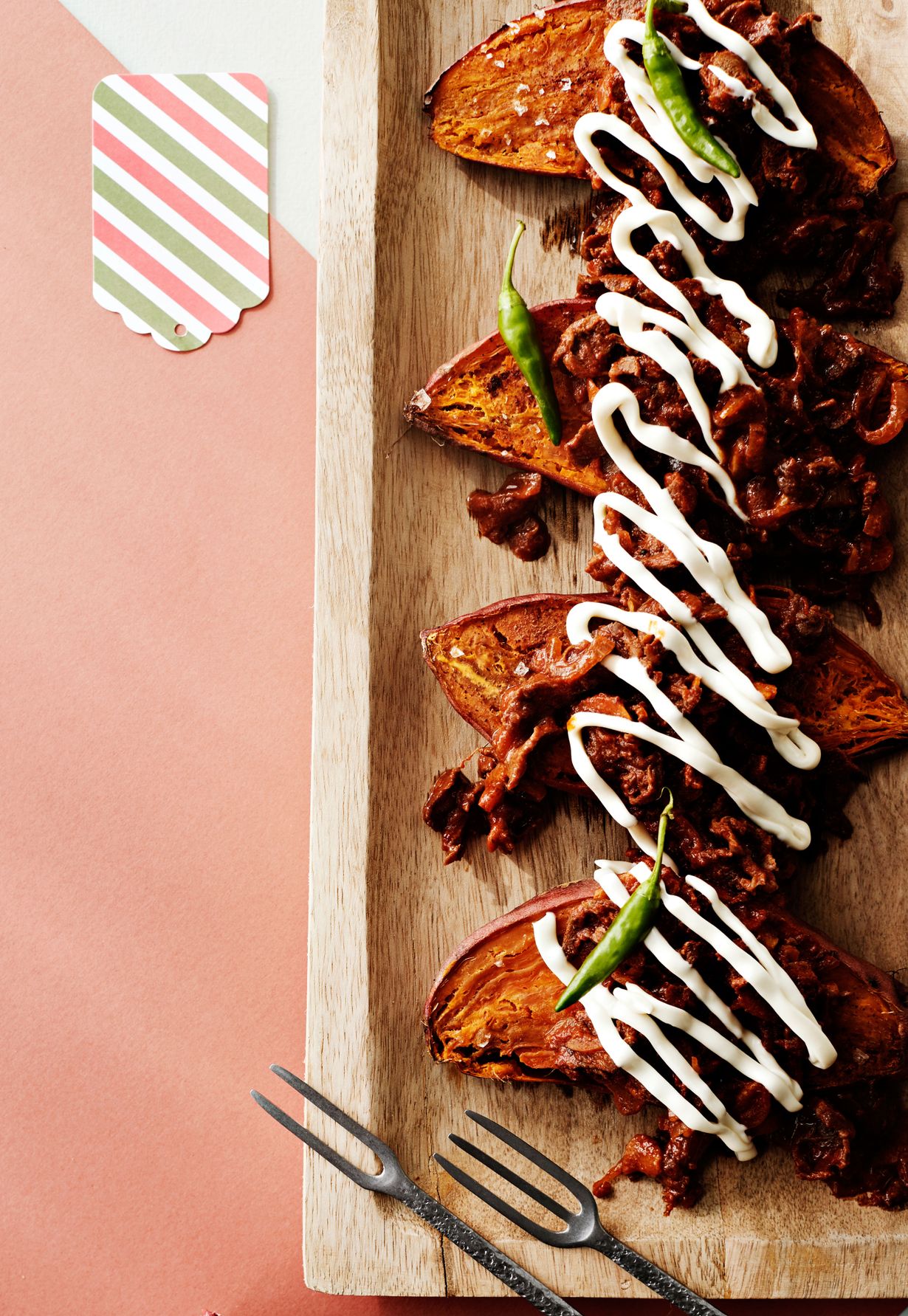 - Lusikoi poronkäristyschili bataattiveneiden päälle ja tarjoa ranskankerman kera.