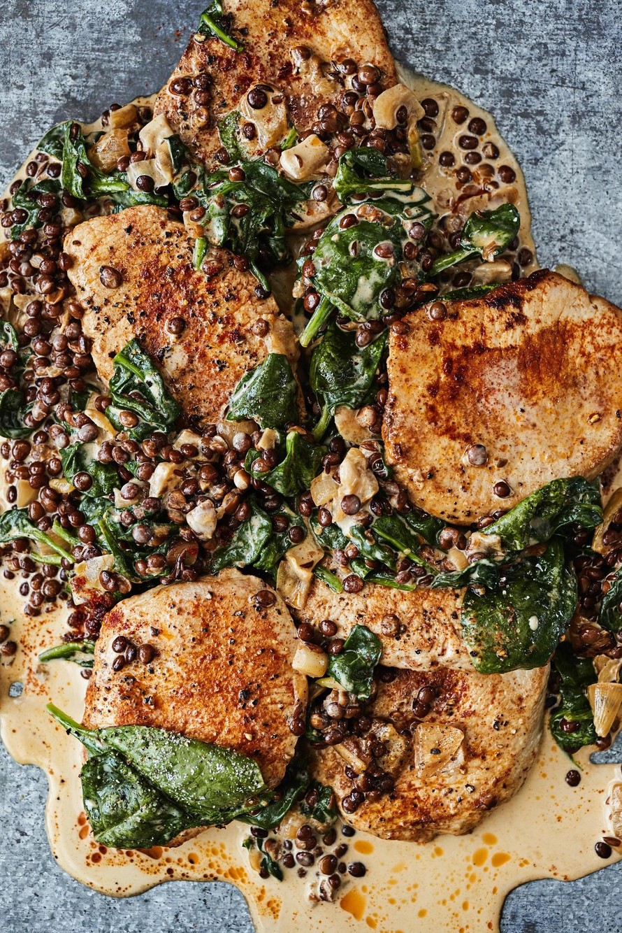 - Lisää 1 rkl öljyä pannuun ja kuullota siinä sipuleita ja kuminaa 1 minuutti. Lisää kerma, kiehauta ja keitä 5 minuuttia. Valuta linssit. Lisää ne ja pinaatit kastikkeeseen. Kypsennä vielä 3–5 minuuttia.