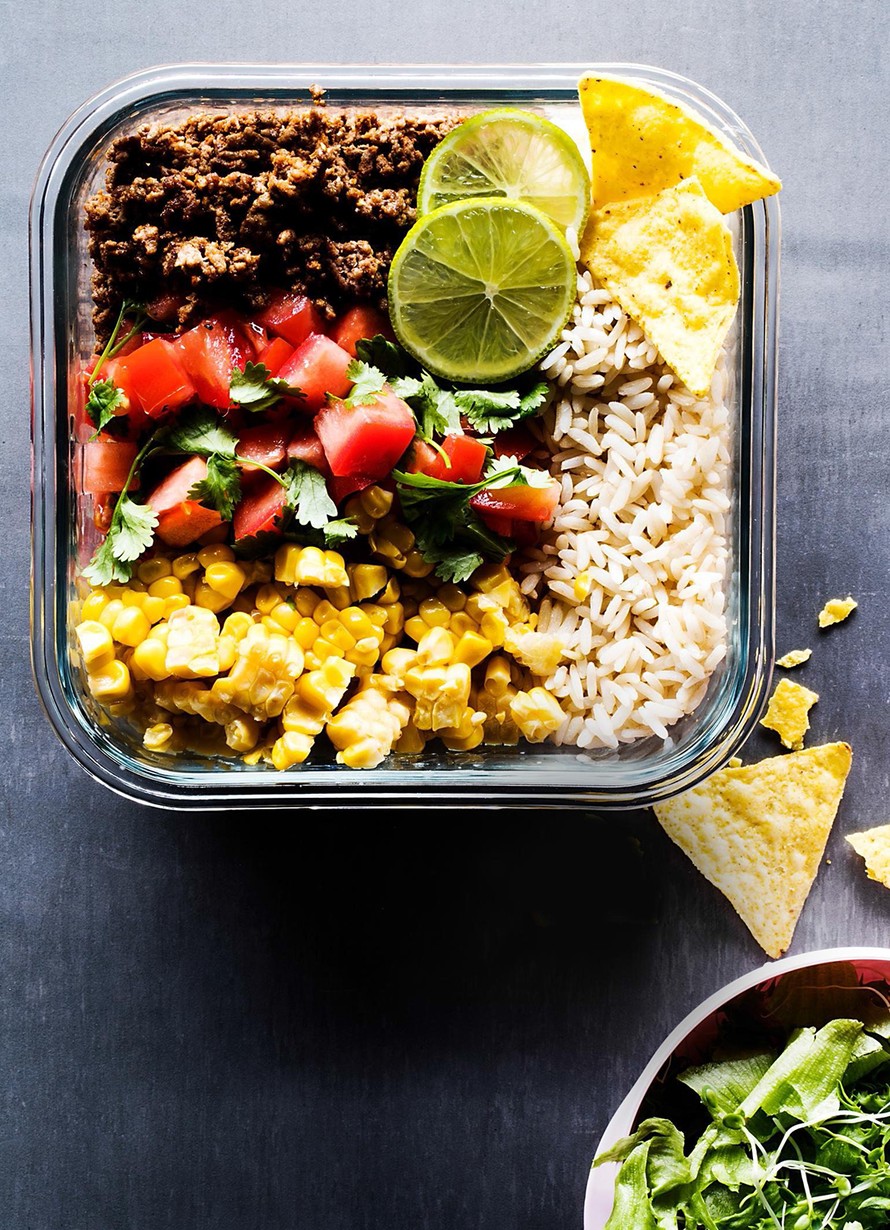- Kokoa lounasrasiaan aiemmin paistettu, Fajitamaustettu jauheliha, keitettyä riisiä, tomaattia ja maissia. Pakkaa erilliseen pussiin tai rasiaan mukaan rapeaa salaattia ja nachoja.