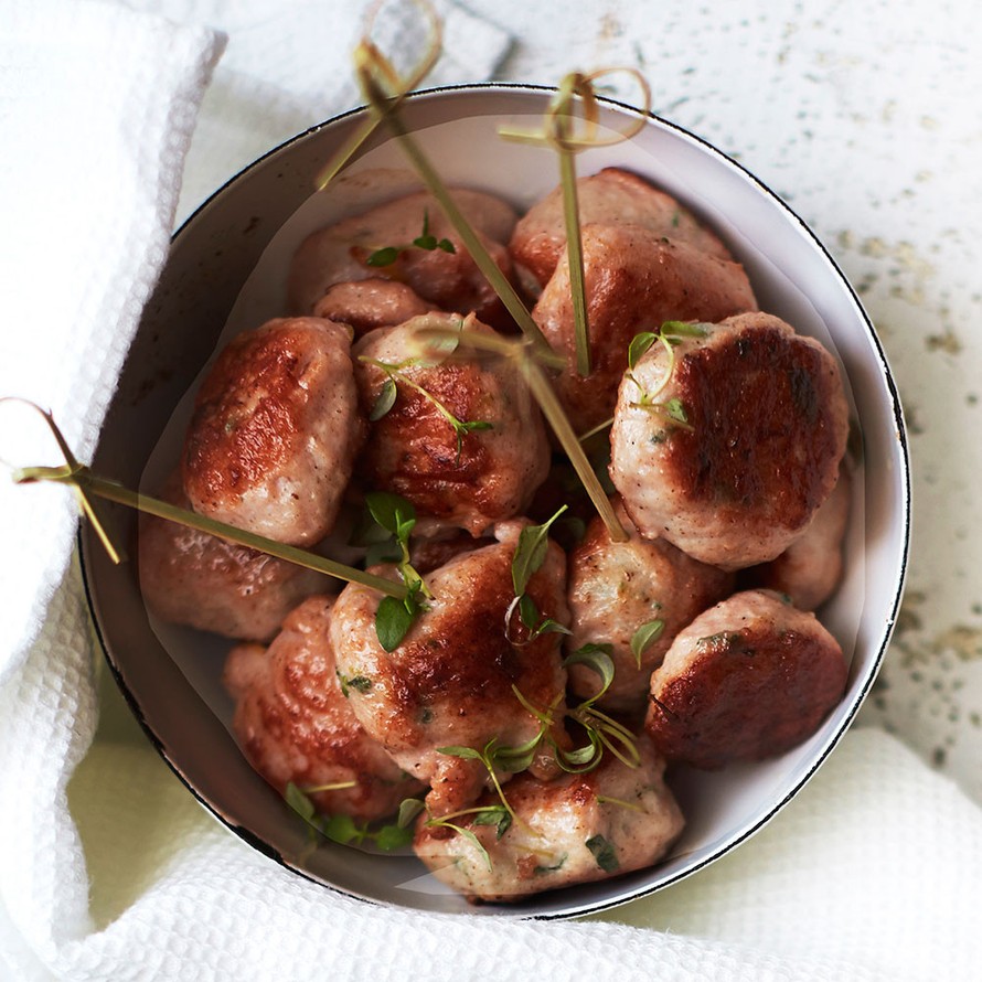 - Kuumenna öljy paistinpannussa. Muotoile siskonmakkaraseoksesta pieniä palloja kahden ruokalusikan avulla pannuun. Paista noin 10 minuuttia eli kunnes pallerot saavat kauniin värin ja ovat sisältä mehevän kypsiä. Pujota vartaisiin ja tarjoa kuumina peruna-sipulisalaatin kanssa.