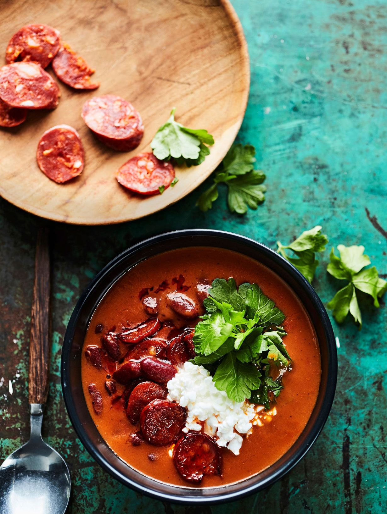 Espanjalaisesta chorizomakkarasta ja intialaisen keittiön garam masala -mausteseoksesta valmistuu maukas tomaattikeitto pikana. Keiton maku pyöristyy kookosmaidolla. Voit korvata sen myös kaurakermalla. Kidneypavut antavat mukavasti proteiinia.